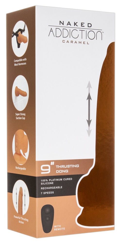 The flexible thrusting dildo 9" Thrusting Dong from Naked Addiction is in a realistic penis shape and has delicate veins and bulging glans. It has a suction cup underneath the large testicles that can stick securely to any smooth surface and this makes hands-free fun possible. The suction cup also means that this thrusting dildo is also compatible with strap-ons and harnesses.