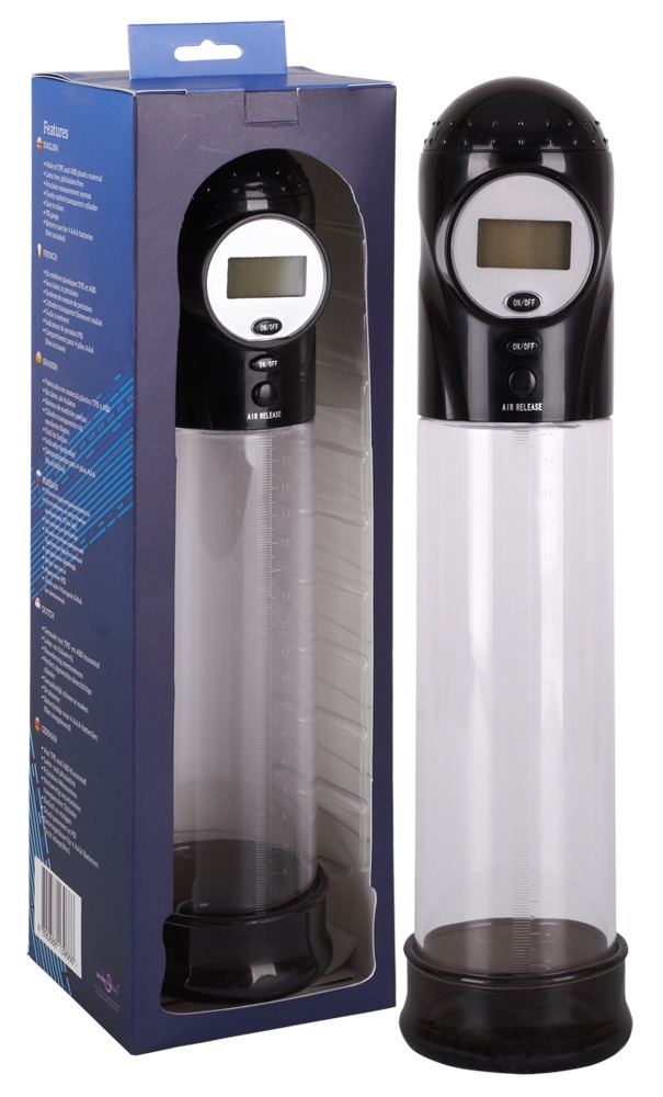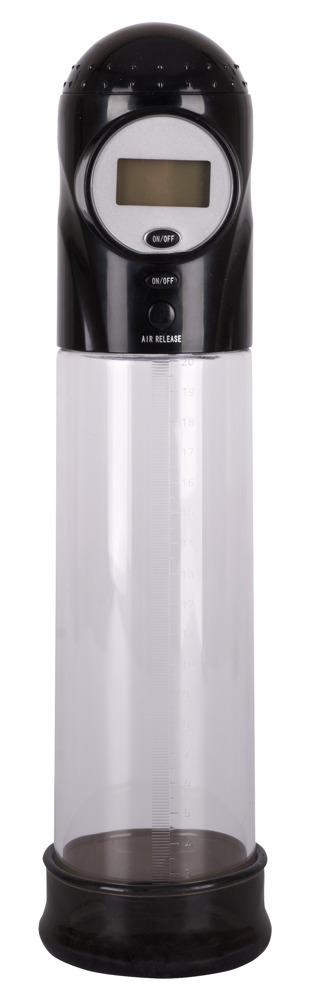 Auto Pump by Seven Creations with a transparent cylinder and 20 cm measuring scale. Quickly and conveniently generates an effective vacuum at the touch of a button to swell the penis to its maximum size and shape. The Air Release Button ensures immediate pressure release. The pressure (psi) can be perfectly controlled on the display. The Auto Pump also works perfectly without switching on the display.