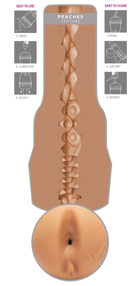 Easy-to-hold masturbator Autumn Falls Peaches from Fleshlight in a discreet pearlescent case. The sleeve's anus hole is an original replica of erotic star Autumn Fall's anus. The various textures with different diameters inside the pleasure canal feel a lot like Autumn's tight anus and it is perfect for an intense, orgasmic massage during a hand job. The inner sleeve is made out of very soft, skin-like material. There is also Autumn's signature next to the hole. The case also has a protective lid. The sleeve can be removed from the case for cleaning.