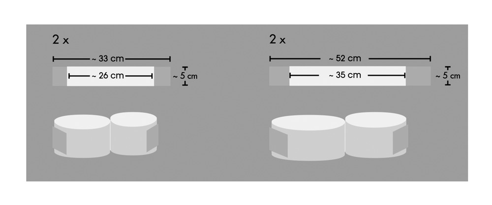 All restraints have a double strap: 35 - 52 cm long or 26 - 33 cm long, 5 cm wide. Black. Polypropylene.