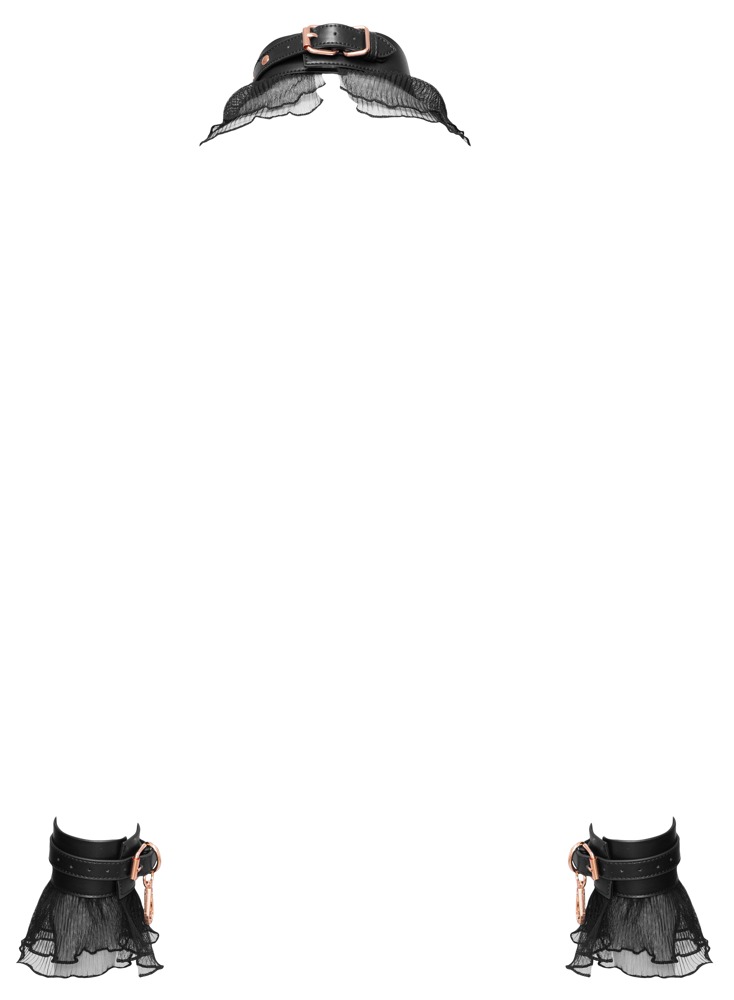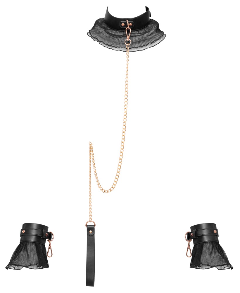 The high-quality bondage set from Bad Kitty consists of a collar with leash and handcuffs. They are in a realistic leather look with delicate pleated frills and gold-coloured metal elements. All the restraints are comfortable and they can also be adjusted. Each handcuff has a ring and a snap hook. The collar with a ring has a removable chain leash with a snap hook and a hand loop.
