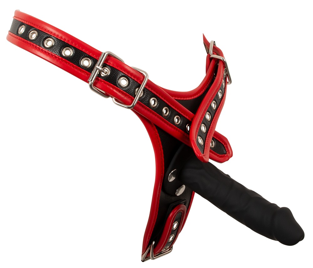 The strap-on harness from Bad Kitty comes in a stylish leather look with 3 silicone dildos in different sizes that can be attached to the front or inside with press studs. The size can be adjusted to fit with buckle closures at the sides.