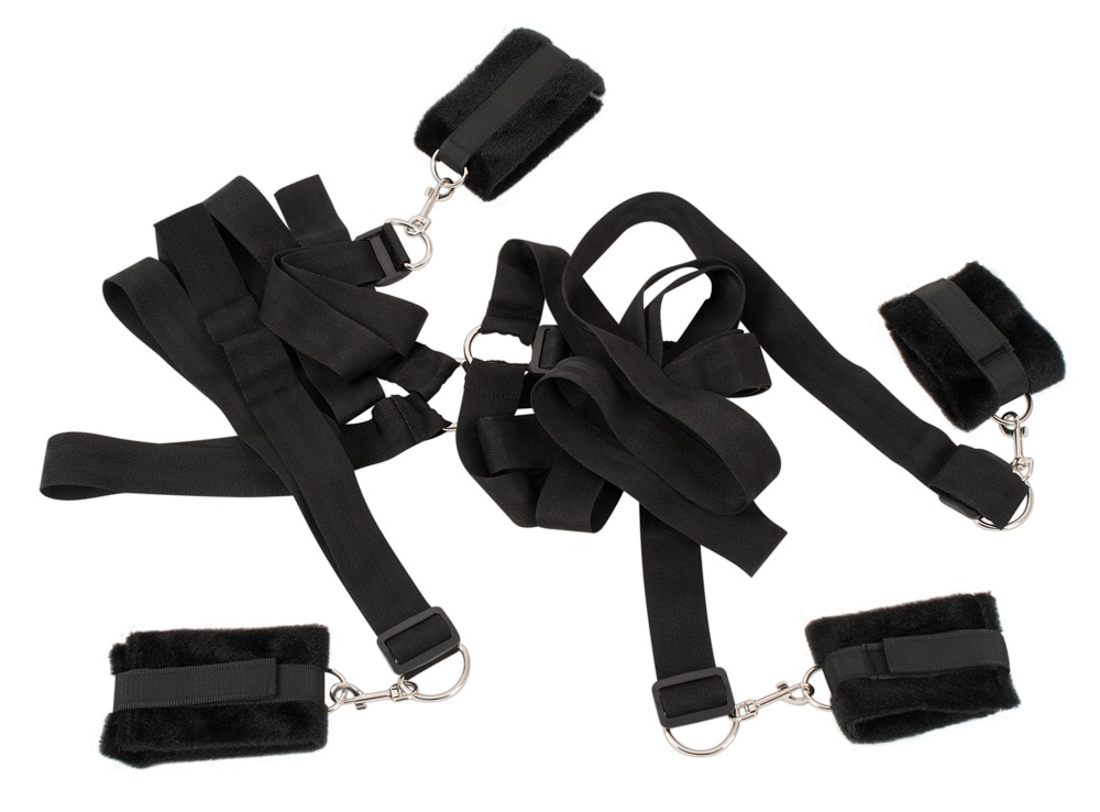 With the 5-piece Bed Shackles set from Bad Kitty, any bed can be transformed into a professional bondage playground. Whether at home or on the road. The adjustable cross is placed under the mattress. The wrist and ankle restraints are then simply hooked onto the straps with the snap hooks. The soft comfortable wrist and ankle cuffs are equipped with practical hook-and-loop fasteners and can therefore be adjusted to fit.