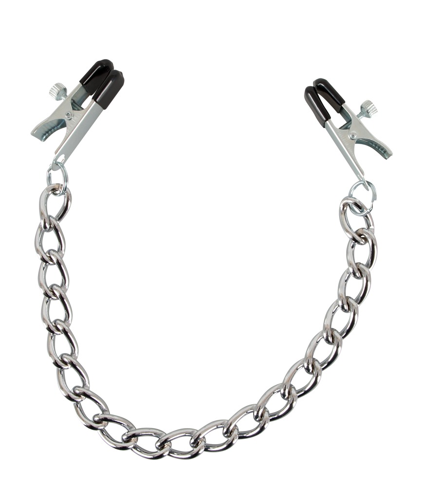 Nipple clamps (removable protective covers) on a strong chain. The pressure intensity of the clamps are separately adjusted using the screws. Complete length 43.5 cm. Each clamp 2.3 cm long. Weight approx. 100 g. Material: silver-coloured metal (crome-plated and zinc-coated), PVC (protective covers).