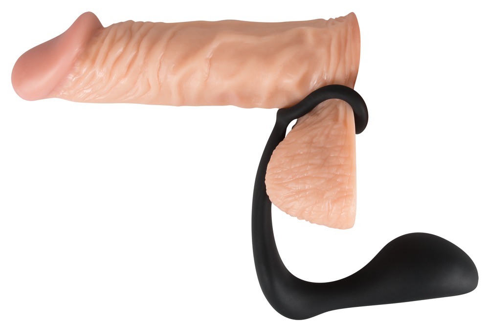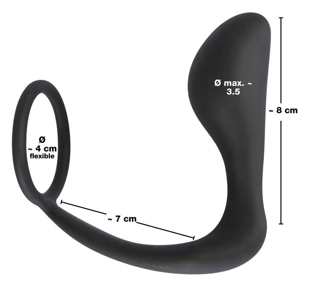 Black. Cock ring Ø 4 cm (flexible), connection bridge 7 cm long, plug 10 cm long, insertion depth 8 cm, Ø 1.1 to 3.5 cm. Material: silicone with a PU coating.