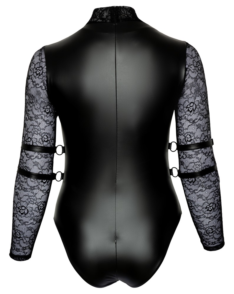 The extremely detailed body from Cottelli BONDAGE PLUS is made out of smooth matte look material and has long lace sleeves and a stand-up collar with a ring at the front. The front of the body is in a harness style with adjustable straps and there is a long zip at the back. The two zips over the breasts and the zip over the crotch can be opened quickly for spontaneous sex. The 4 restraints guarantee captivating moments of pleasure. They have snap hook chains and can be attached to the rings at either side of the waist strap. The restraints with hook and loop fasteners can be adjusted and are easy to put on. The 2 adjustable suspender straps at the front can be removed from the briefs part.