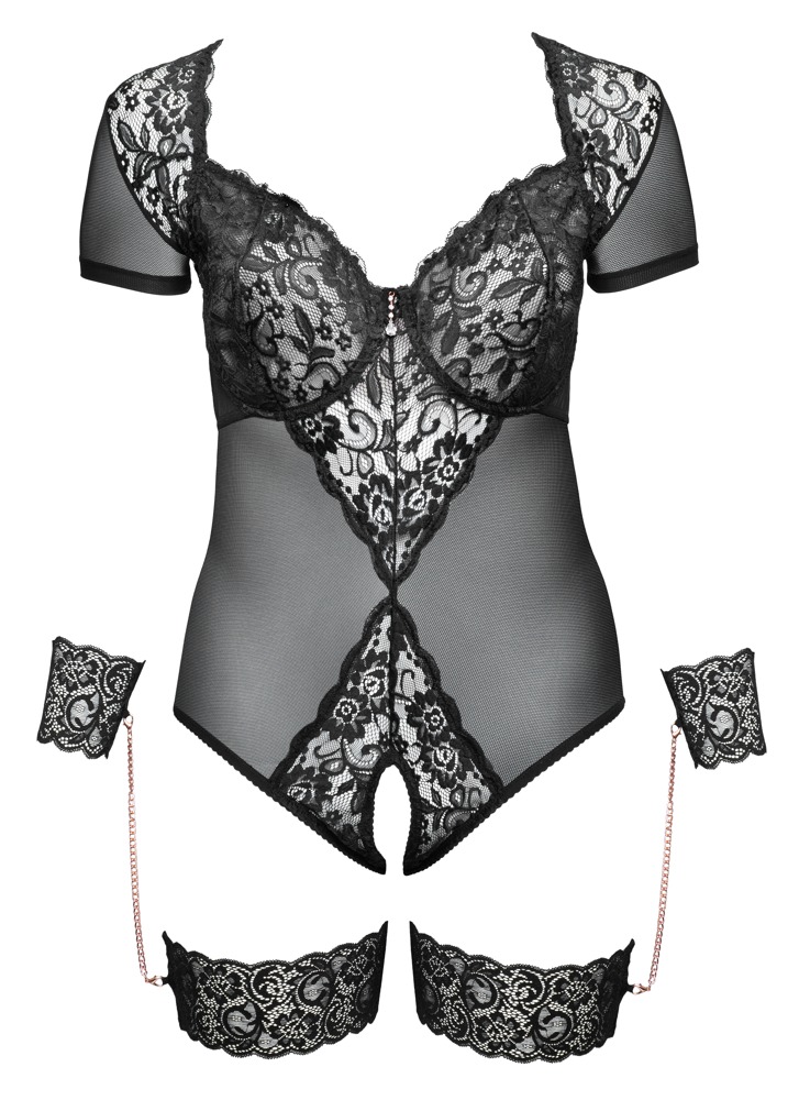 Crotchless body from Cottelli BONDAGE made out of stretchy powernet with delicate lace inserts. With short sleeves and rhinestone decoration between the underwired cups. There is a hook fastener at the back. The briefs part is crotchless. The front of the briefs are made out of lace and the back part is made entirely out of powernet. Includes lace handcuffs and thigh cuffs which are joined to each other by rose-gold coloured chains (with snap hooks).