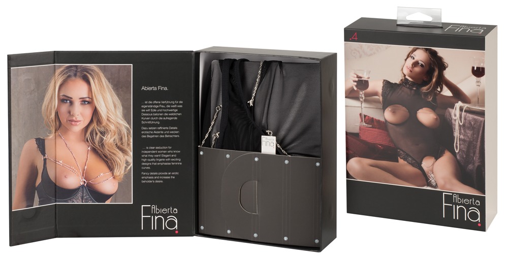 Black transparent body with lace trimmings on the sleeves, collar (2 buttons at the back) and around the legs. Breasts and crotch are open and decorated with detachable chains. Black. 90% polyamide, 10% spandex.