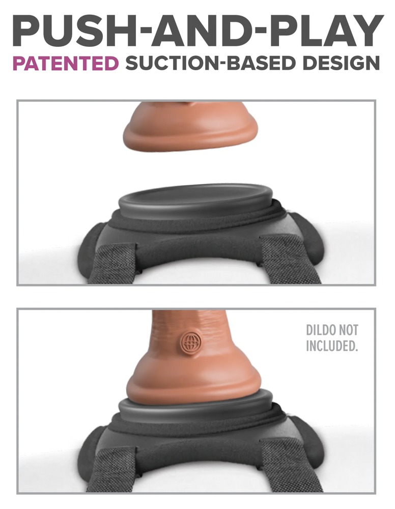 The simple comfortable strap-on system features an anatomically curved docking plate for attaching any suction cup dildo or vibrator (not included). The dildo/vibrator is held in an optimal position (push & play). The softly padded silicone docking plate distributes the pressure evenly over the leg area to avoid unpleasant pressures. Everything adapts perfectly to the anatomy and movements. The sturdy wide straps are adjustable with plastic sliders for a firm and comfortable fit.