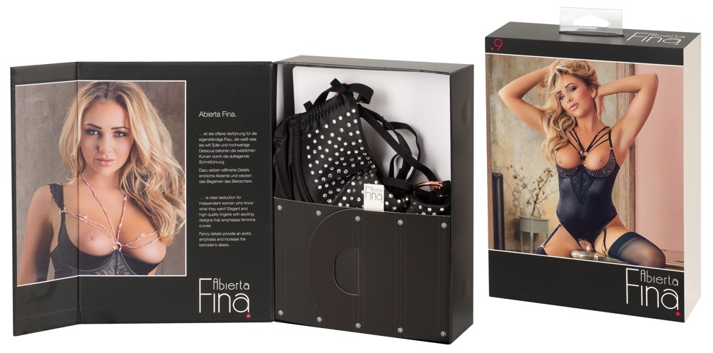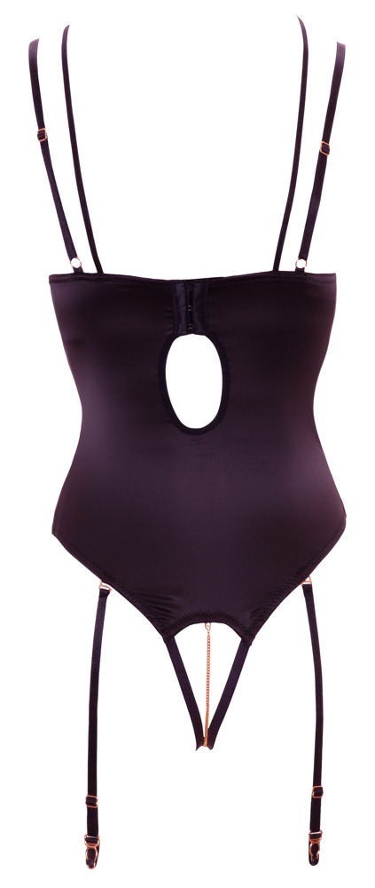 An exclusive body with removable suspender straps and underwired, padded cups. The small, fancy details make all the difference to this outfit. There is a small chain over the crotch that sensually stimulates the wearer every time they move. The cleavage area is decorated with 6 small adjustable straps that also have two sparkly rings to finish off the look. The underwired shelf bra shapes the breasts and puts them in the limelight. The hook fastener at the back provides a perfect fit.