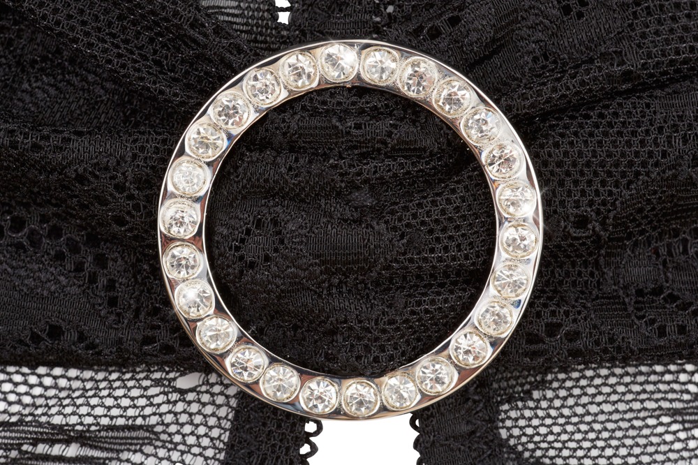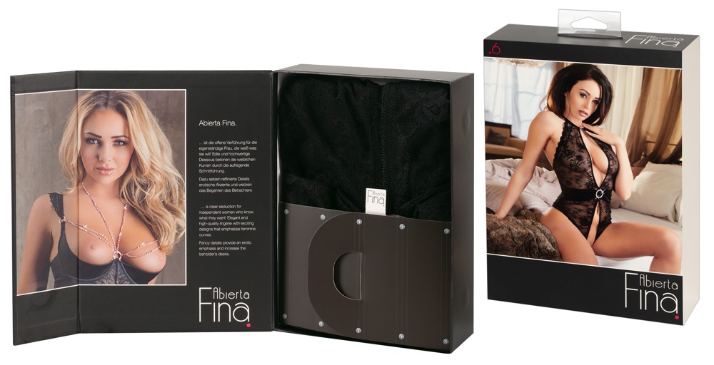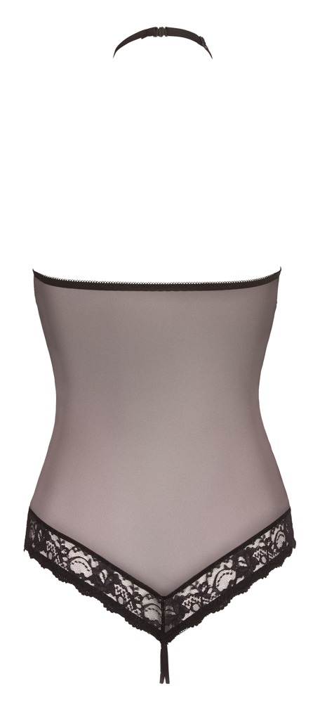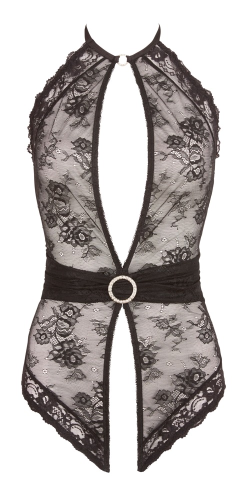 The transparent black body with its adjustable halterneck looks very beautiful because its fancy design puts your seductive, feminine curves in the limelight! The front of the erotic body is made out of floral lace, the back is made out of powernet and it has lace on the hem as well. It is also open at the front and over the crotch area, and is only held together by a rhinestone ring on the halterneck collar and a rhinestone buckle in the waist area.