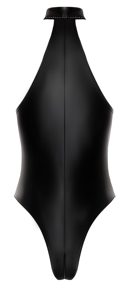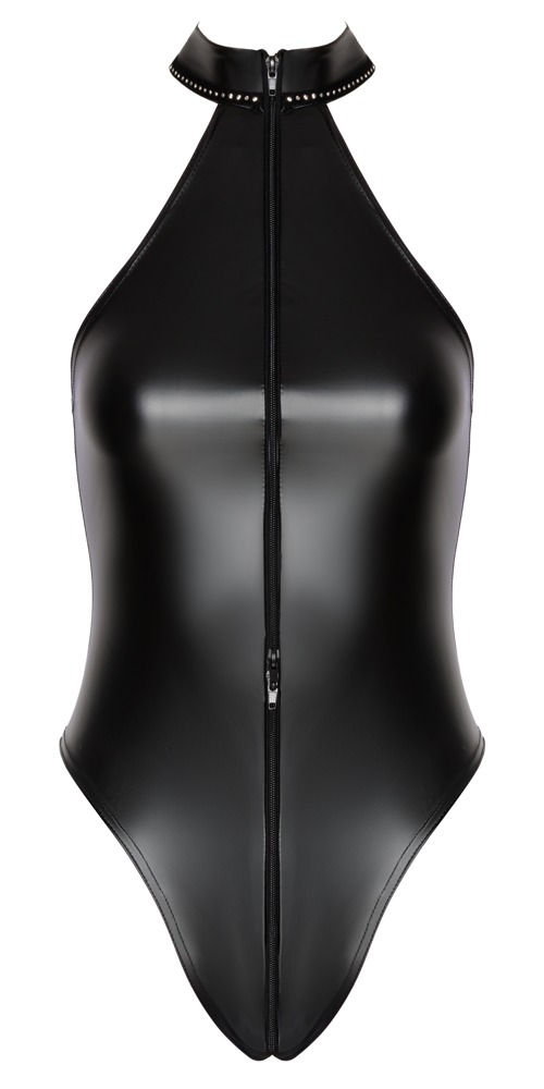 Accentuating Body from Noir in black powerwetlook – fits like a second skin. Soft and stretchy for maximum comfort. Close-fitting off-the-shoulder style with sparkling rhinestones on the stand-up collar. The full-length 2-way zip runs from the collar through the crotch to above the bottom. Extra-high leg cut-outs show off the bottom and legs in an exciting way.