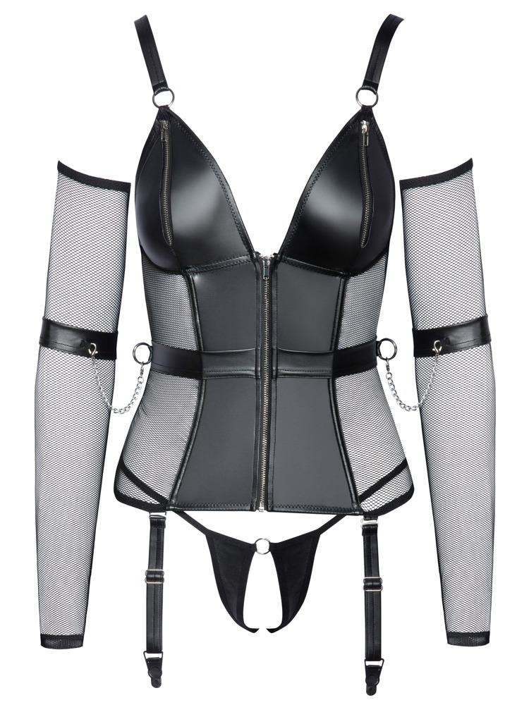 The lingerie set from Cottelli BONDAGE contains a basque, crotchless string, gauntlets and arm restraints. The set is in a stylish, stretchy material mix of matte look and net. With silver-colored accessories. The basque has a full-length zip at the front and zips over the pre-formed cups. With shaping wires for a perfect fit. The wide straps can be adjusted to fit. There is a ring at either side of the waistband and at the back of the waistband. The rings are for attaching the included arm restraints with snap hooks. The restraints can be put on quickly and adjusted to fit, thanks to their hook and loop fasteners. The adjustable suspender straps are removable. The long, soft net gauntlets and the crotchless, matte look string complete this captivating outfit.