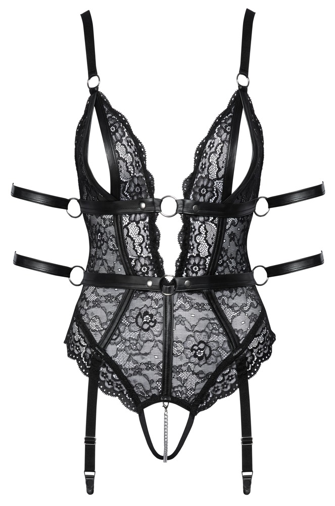 The crotchless lace body from Cottelli BONDAGE has 2 removable suspender straps and 4 restraints. It is made out of soft, stretchy, black lace with matte look strap details and silver-coloured accessories. The body is low cut at the front and the back. The soft cups have seductive slits. There is a removable, stimulating chain over the crotch. There are securely sewn-on belts underneath the breast and around the waist. These belts have rings at either side. The 4 included restraints for the arms can be put through the rings. The soft restraints have hook and loop fasteners, which means that they can be put on and taken off quickly. The suspender straps can be adjusted and removed.
