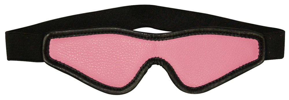 Pink/black fetish set, consisting of an ostrich feather, blindfold, handcuffs with hook and loop fasteners and short connection chain, a small whip and a paddle.
