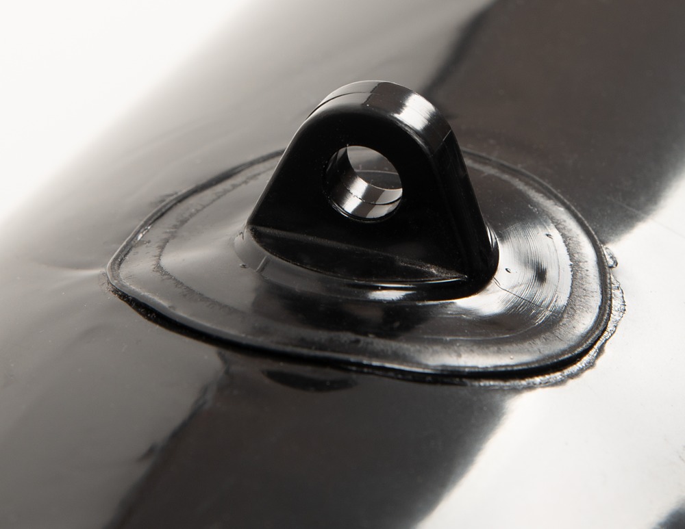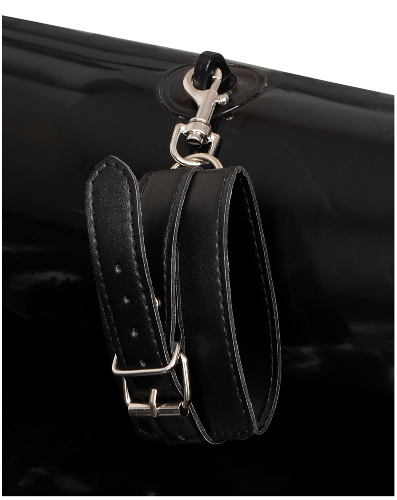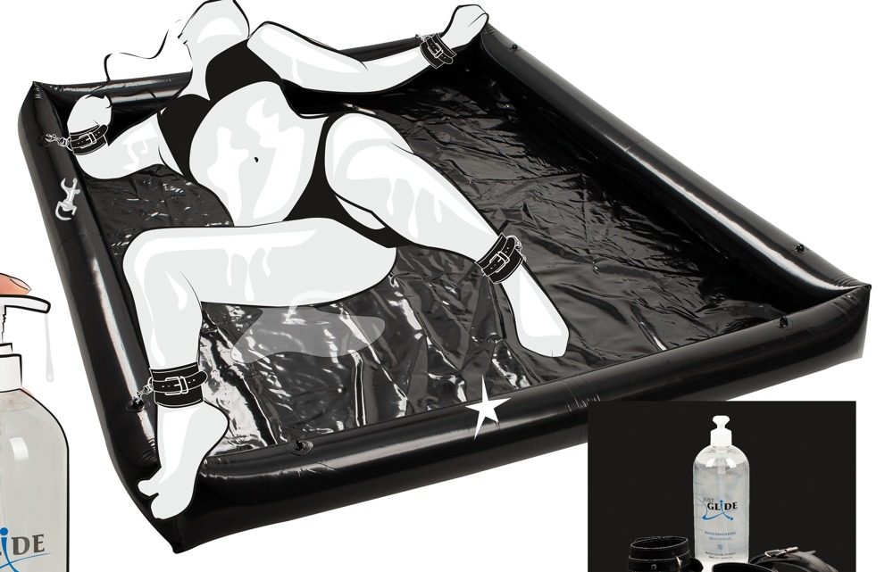 Black vinyl sheet Glossy Games from fetish collection that includes 4 restraints and 1 litre of lubricant. The sheet with an inflatable border (15 cm high) guarantees perfect protection on any surface (e.g. bed, couch, carpet etc.) and offers a lot of space (140 x 185 cm) for extra wet, oily, foamy, wonderfully slippery bondage games. It has 8 welded eyelets (2 in each corner) to attach the included handcuffs and ankle cuffs via snap hooks – it's quick and easy. The sheet can also be wiped easily, which means that it is cleaned and ready for use in no time.