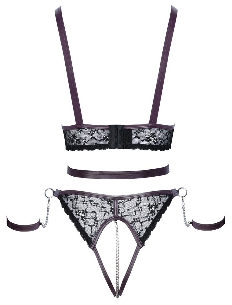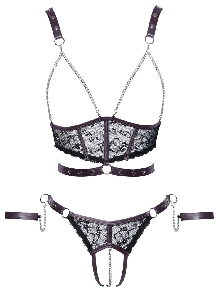 The crotchless set from Cottelli BONDAGE has an open cup top, crotchless briefs and two soft handcuffs. It is made out of a stylish mix of delicate black lace and dark purple matte look details. It also has silver-coloured accessories. The top frames the uncovered breasts with chains. The waist belt on the front ring can be adjusted with press studs. The bra straps can also be adjusted. With an adjustable hook fastener at the back. The briefs have a removable, stimulating chain over the open crotch area. Adjustable waistband with press studs. The restraints can be hooked onto the rings that are either side of the waistband. The restraints have chains with snap hooks. The soft restraints can be put on and taken off quickly, thanks to their hook and loop fasteners.