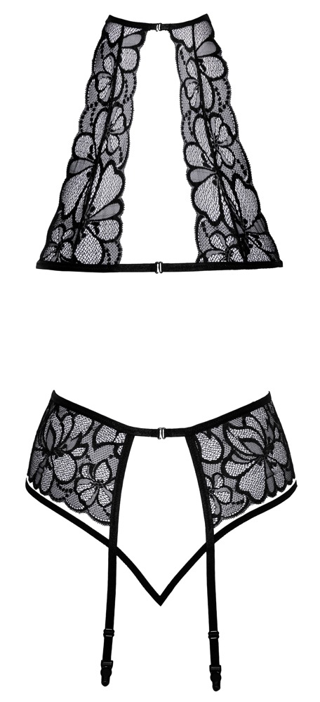Wireless bra, suspender belt & string in a set from kissable. All pieces are made entirely out of delicate floral lace and they are soft and stretchy for a comfortable fit. Stylish bra with a hook fastener at the back and at the back of the neck. The suspender belt has a hook fastener at the back, the suspender straps can be adjusted. The seductive small string has two narrow stretchy straps that come together in the crotch area.