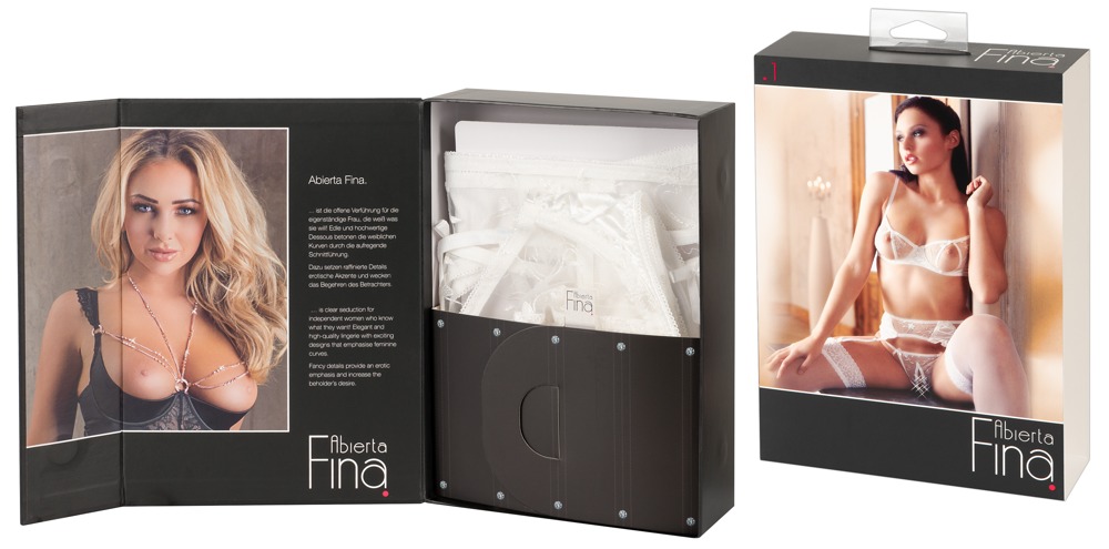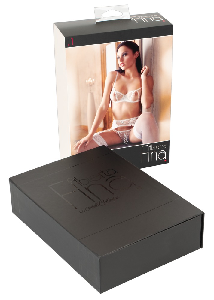 A delicate set made out of delicate, embroidered net (mesh) combined with stretchy satin and little bits of decorative lacing. Underwired bra with slits in the cups and adjustable bra straps. The suspender belt has adjustable suspender straps and a hook fastener at the back. A matching crotchless string is also included in the set.