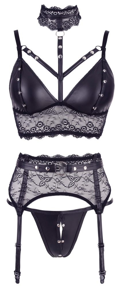 Beautiful bralette with removable cups (can be unbuttoned), adjustable straps in the cleavage area and a choker. The matching suspender belt has an eye-catching design with a strap that has a decorative ring at the front. It also offers adjustable suspender straps and removable handcuffs with hook and loop fasteners at the back. Briefs with press studs that go over the crotch and stop at the top of the buttocks. Made out of floral lace in combination with trendy matte look and studs.