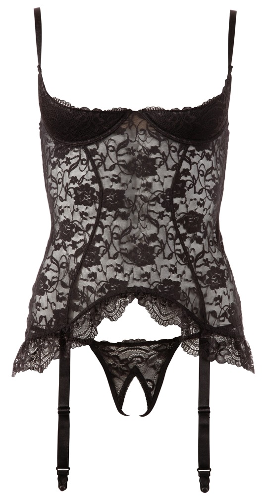 Cami suspender made out of lace with slightly padded open cups. Hook-fastener at the back. The four suspender straps are adjustable and removable. With decorative ruffles on the hem. Includes a matching crotchless string. Black. 90% polyamide, 10% spandex.