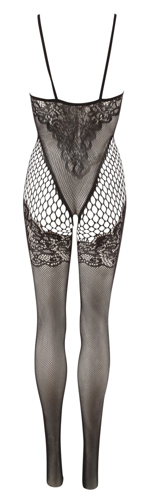 Black catsuit with a lace-style pattern in the chest area, around the thighs and around the open crotch. Seamless. Stretchy straps. With foot part. 90% polyamide, 10% spandex.