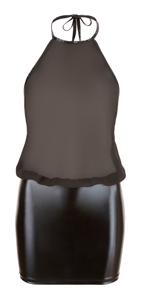 A black dress with a halterneck that ties at the back. It is a high-neck dress and is completely backless. The shiny wetlook skirt part is skin tight, and the transparent chiffon top part is loose and sexy. What a hot combination!