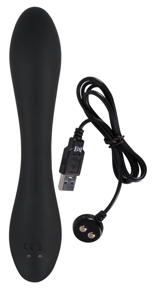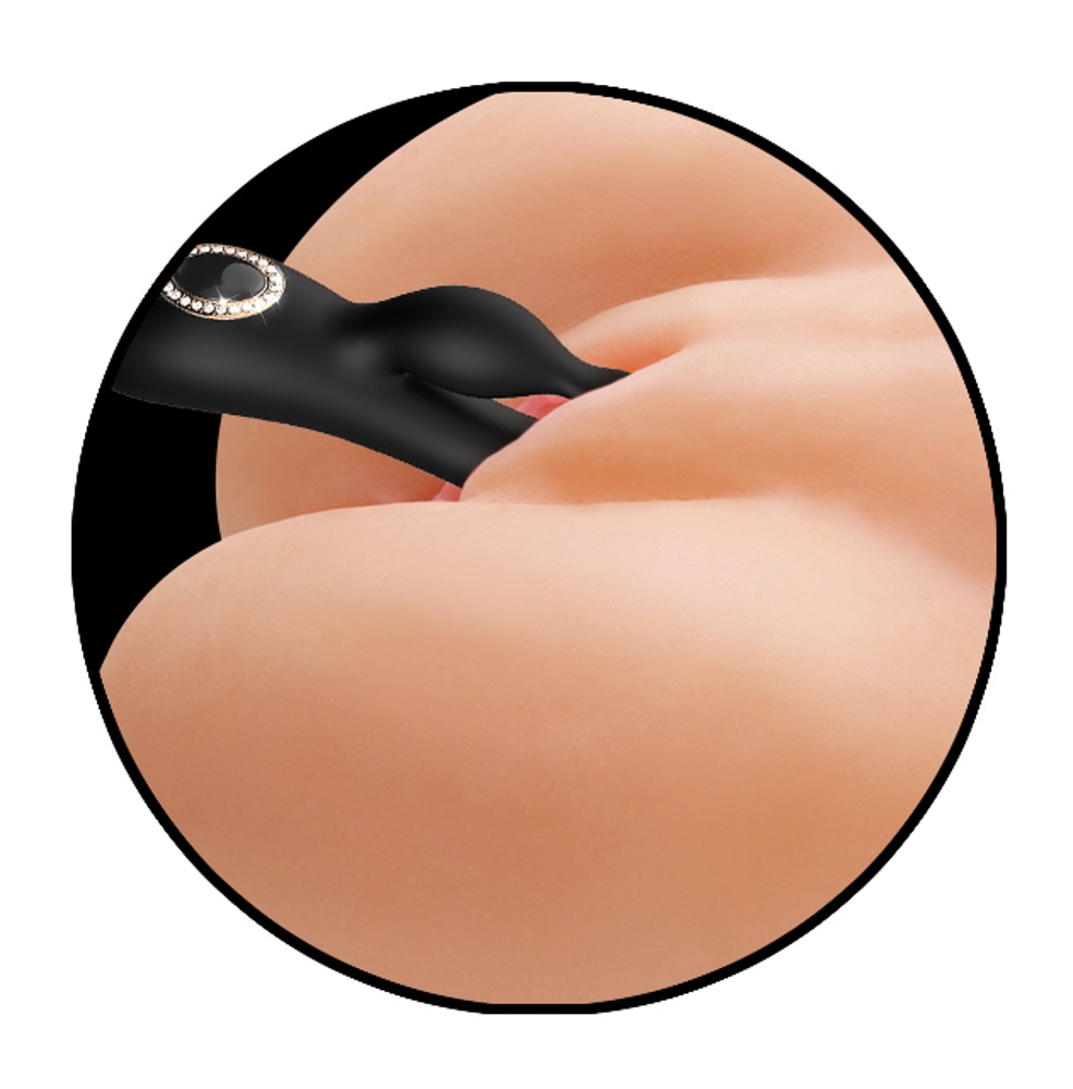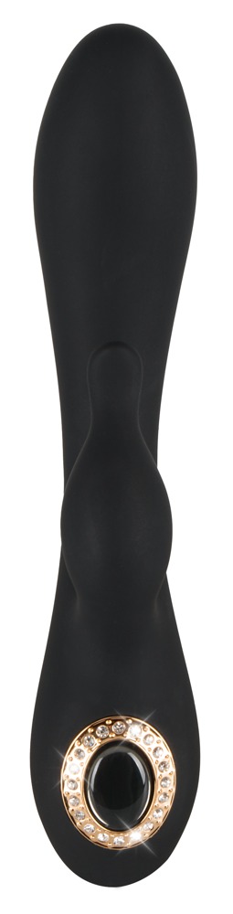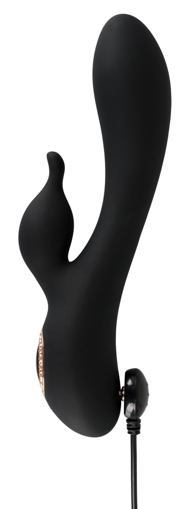 Black Rabbit Vibrator from Cleopatra with two motors and a decorative shiny copper part at the bottom of the shaft. With a curved, ergonomically shaped G-spot tip and clitoral stimulator. It makes simultaneous stimulation of these pleasure zones possible – it also stimulates these areas with 10 vibration modes. Easy-to-use and intuitive control at the push of a button. It is also waterproof which means that it can be used in the bath or the shower. Includes a USB cable.