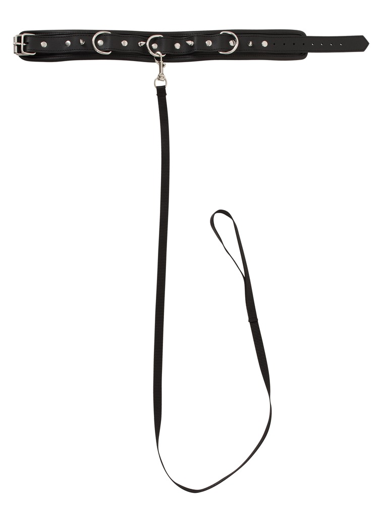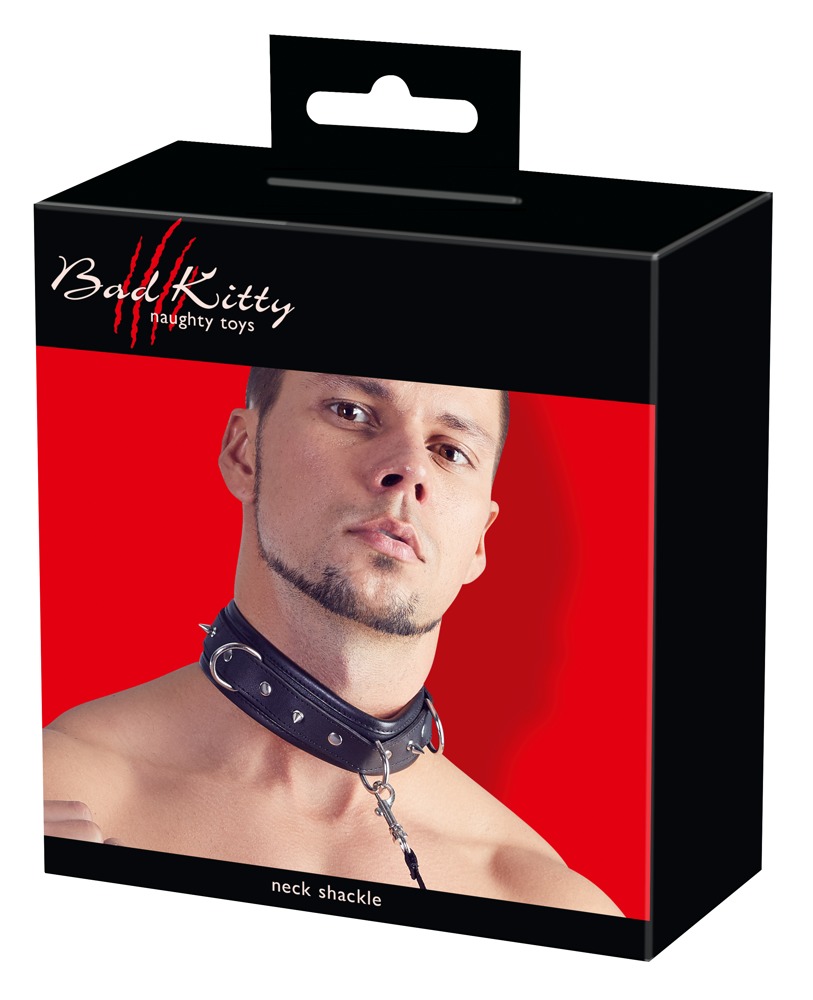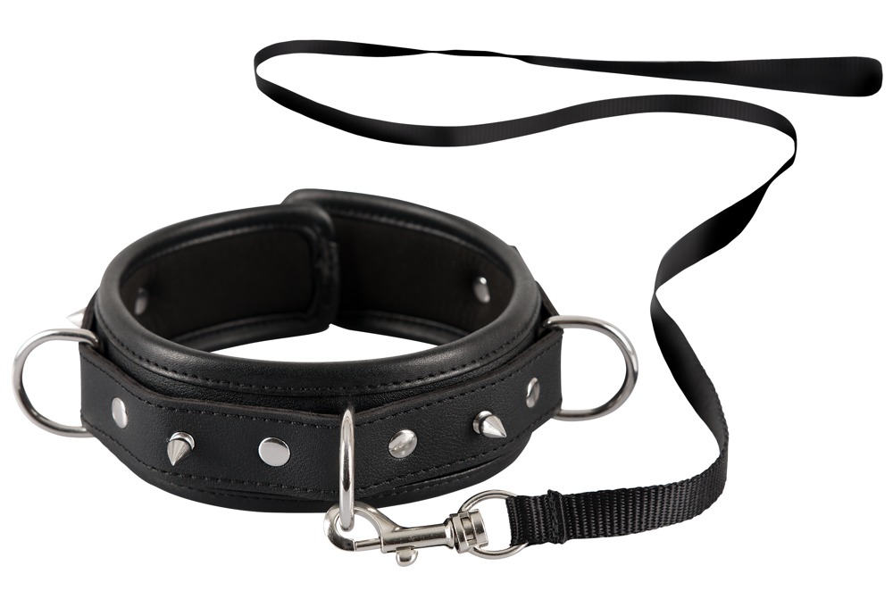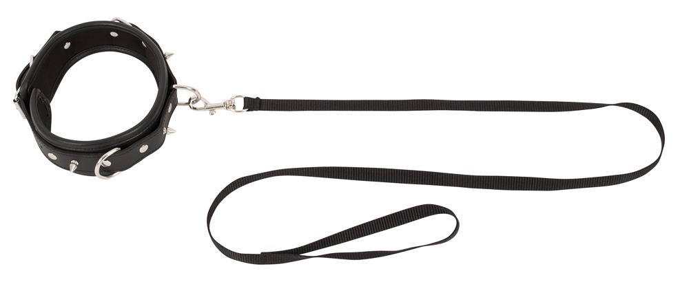 Padded and adjustable collar cuff made of imitation leather. With decorative spikes and 3 D-rings. The included leash is detachable. Collar 37-47 cm long, leash 112 cm long.