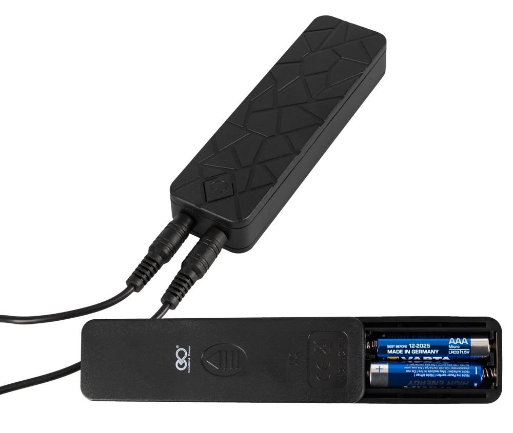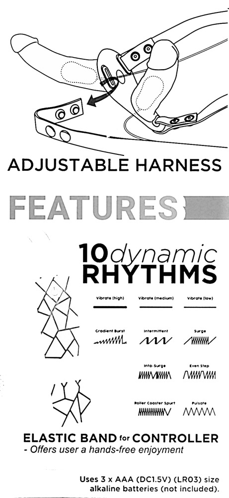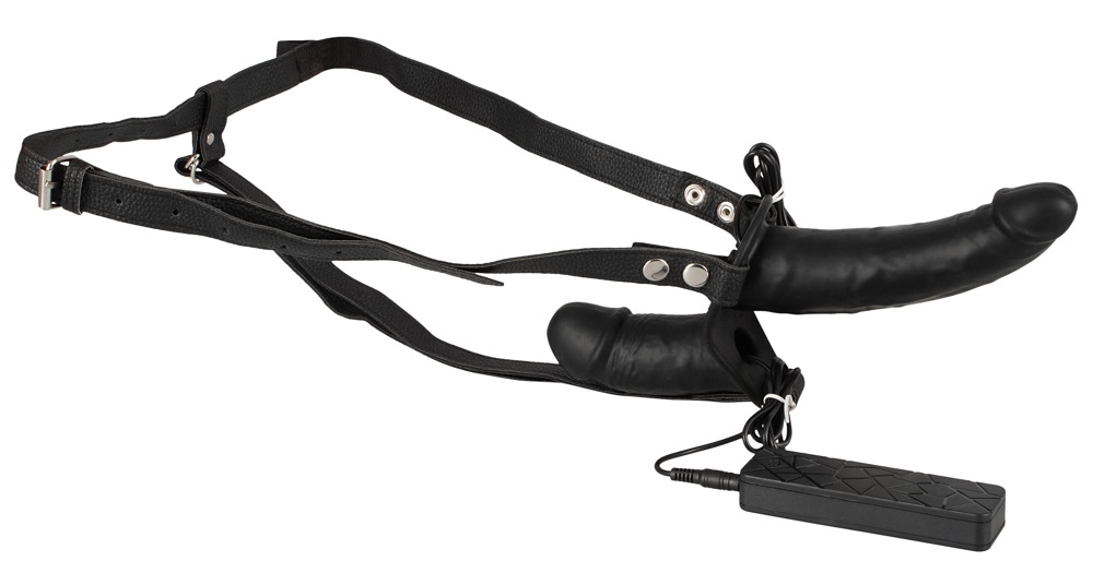 A black strap-on vibrator with a large external vibrator and a small internal vibrator. The large external vibrator (17 cm long, Ø 3-4.3 cm) is slightly curved and can be used to penetrate the passive partner. The small internal vibrator (9.3 cm long, Ø 3.8-4.2 cm) is for penetrating the active partner. Both the vibrators have large glans, pronounced veins and 10 vibration modes that can be controlled with the remote control on a wire. The remote control can be placed into the small loop on the harness so that the hands are free to do other things. There are 12 holes in the harness so that the circumference can be adjusted from 78 cm to 108 cm. The string is 96 cm long and can be adjusted to fit. Please order batteries separately: 3 x Micro/AAA.
