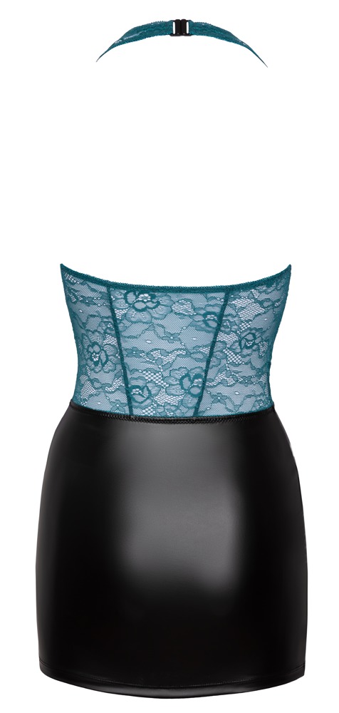 Tight-fitting short dress from Cottelli LINGERIE in a two-piece look. The top part is made out of fine, teal lace and the skirt part is made out of beautiful black matte look material. Deep neckline up to the navel - 3 rose gold-coloured rings and stretchy straps hold everything together nicely. Backless, the halterneck has a clip fastener.