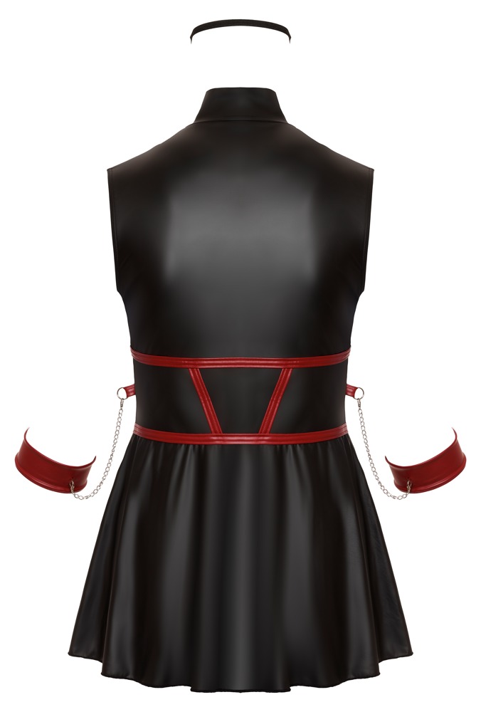 Sleeveless, short dress from Cottelli BONDAGE PLUS in a tight cut with a flared skirt. The dress is completely stretchy and has an elegant black matte look with red contrasting stripes in a waist-accentuating bodice look. Each side has a ring for the two included soft arm cuffs with their snap hook chains. The cuffs are adjustable with hook-and-loop fasteners. Front with full-length 2-way zip that can be opened from the stand-up collar and the seam. A lightly padded eye mask is also included and fully opaque for exciting play.