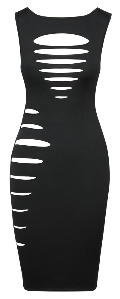 Tight-fitting, sleeveless, knee-length, dress from Cottelli PARTY made out of delicate transparent black material. With fancy cut-outs at the front and on one side for exciting insights. It is soft and stretchy for a very comfortable fit.