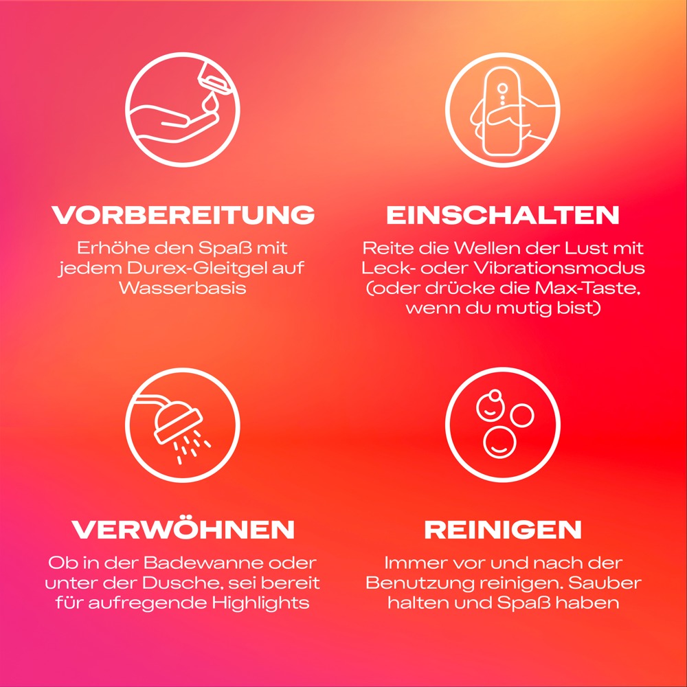 Handy Sensorial Masturbator Ride & Vibe from Durex for an intensive penis massage. Pamper yourself with a distinctive grooved structure and 7 vibration and 3 licking modes at the touch of a button. Additional MAX button for immediate full power. Also waterproof in the bath and shower. Made from silky-soft silicone, the flexible masturbator adapts perfectly to the penis and its movements. And is therefore suitable for any penis size.
