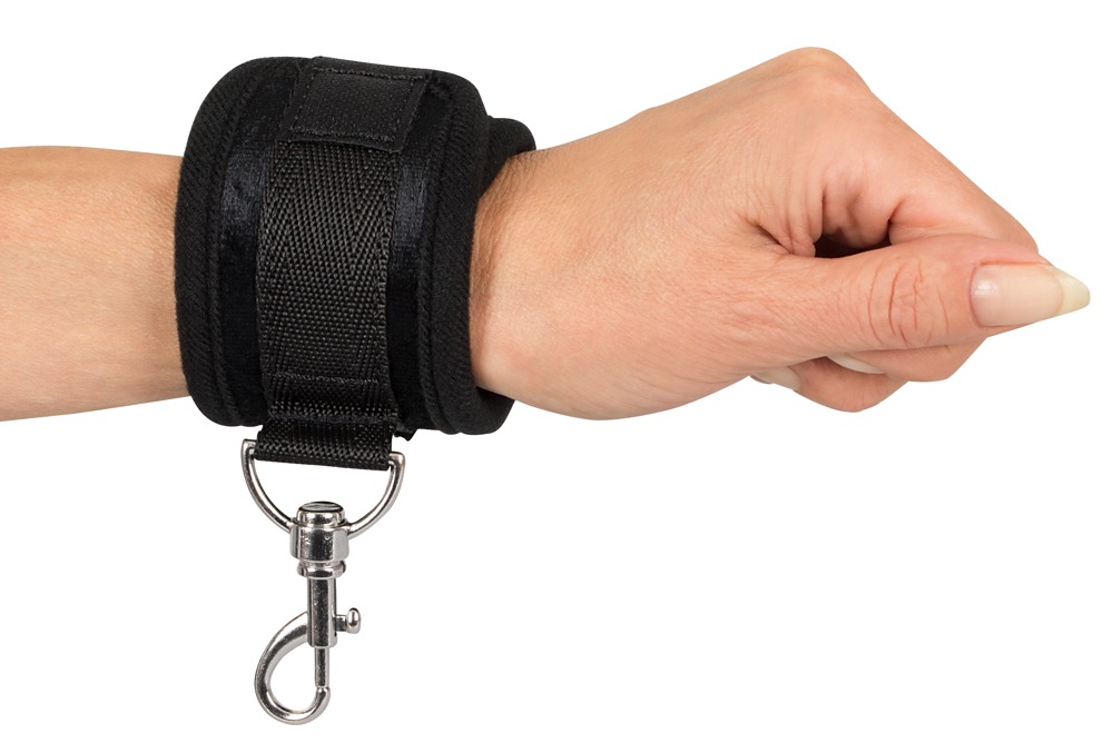 Content: 1 opaque blindfold, 1 pair of handcuffs with hook and loop fasteners and snap hooks, 1 flogger (complete length 40 cm), feather on a stick (complete length 30 cm). Black. Material: polyurethane, polyester, feather.