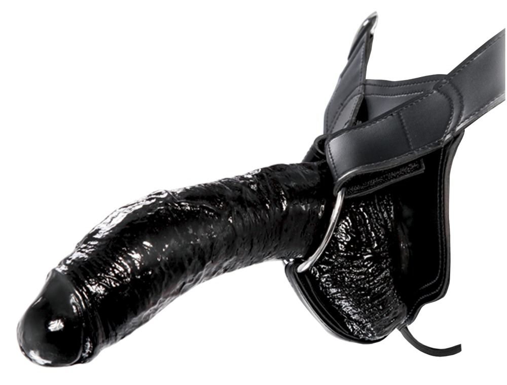 A realistic, hollow strap-on dildo with large testicles and a stretchy strap-on harness. It can be worn on the penis for more length and girth or used for hot pegging fun. The strap-on harness is stretchy and adjustable.