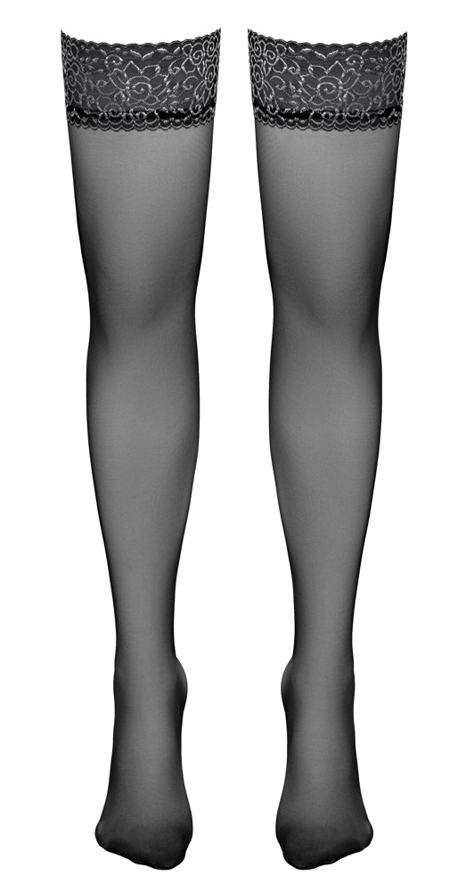 Hold-up stockings with silver-coloured lace top parts and a decorative seam at the back. With silicone lining for a non-slip fit. Oeko-Tex certified.