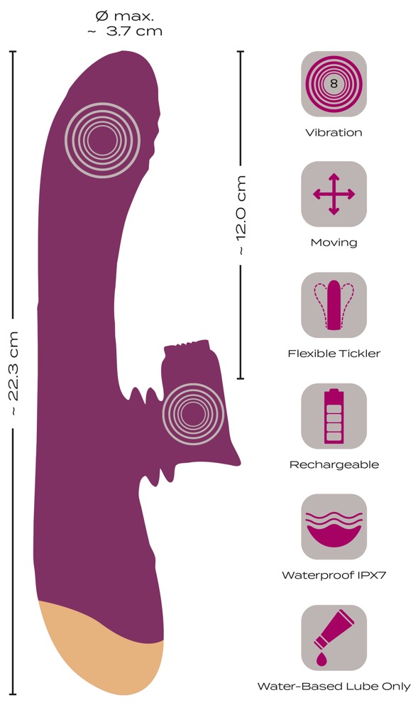 The handy 2 Function Vibrator with Moving Clitoris Tickler from Javida provides internal and external pleasure at the same time! It provides deep vaginal and G-spot stimulation, thanks to its curved shaft and grooved vibro-head. The soft, dotted, flexible vibro-arm provides spot-on clitoral pleasure. It moves rhythmically back and forth (moving) but it always hits the spot. Double orgasm power at the push of a button!
