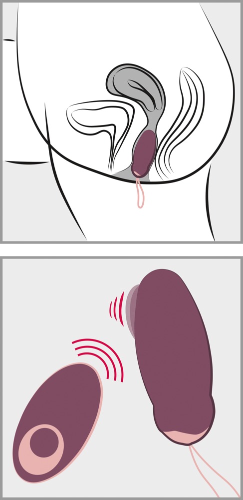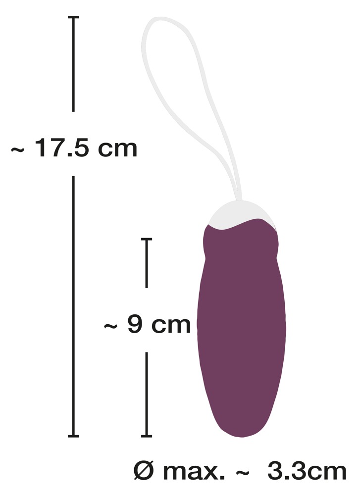 Complete length 17.5 cm. Vibro-love ball 9 cm long, Ø 2.6 cm to 3.3 cm. Weight 46 g. Silicone, PU, ABS.