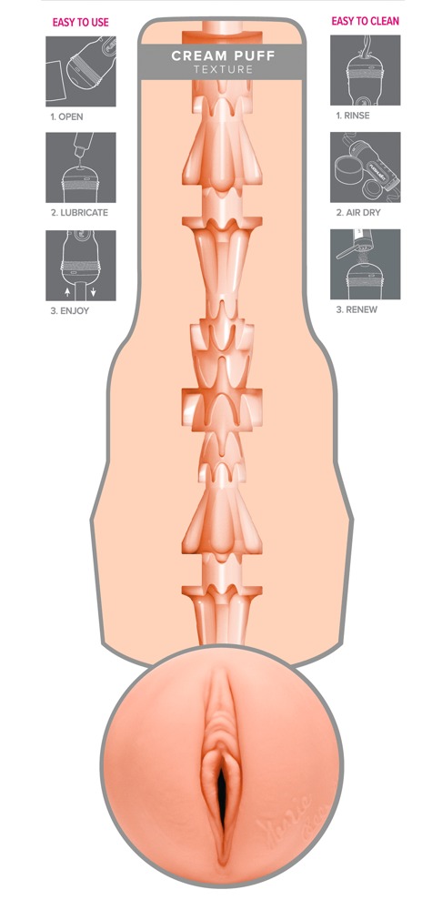 The easy-to-hold masturbator Kenzie Reeves Creampuff from Fleshlight is in a discreet torch design and it has a realistic replica of the erotic star Kenzie Reeves' vagina. The pleasure canal has various stimulating textures and different diameters which means that it feels like Kenzie's tight vagina. It is also perfect for intense, orgasmic massages during a hand job. The inner sleeve is made out of extremely soft, skin-like material. There is also Kenzie's signature next to the opening. The sleeve can also be removed from the case for cleaning.