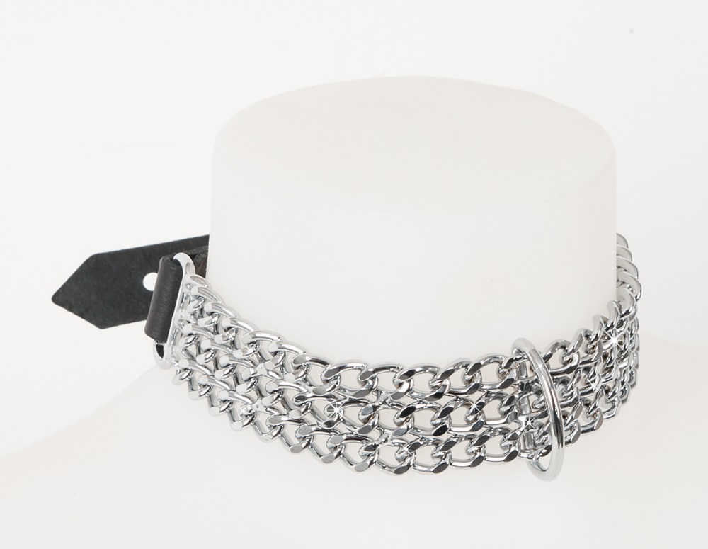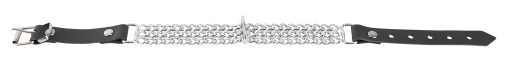 Black leather collar with three metal chains and a centre ring at which a leash can be fixed... Adjustable with a buckle closure.