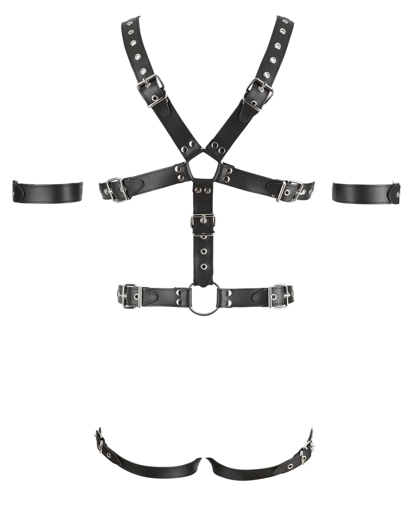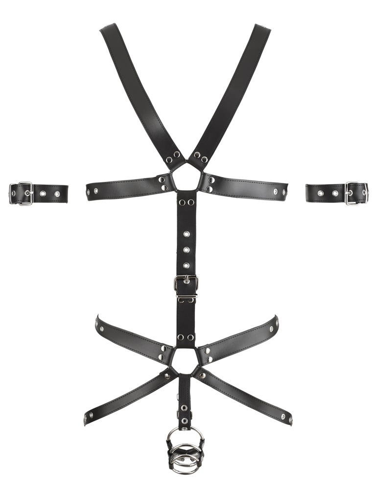 Sturdy one-piece harness with adjustable leather straps and 3 metal rings for the penis and testicles. It puts masculine assets in the limelight and provides more stamina.