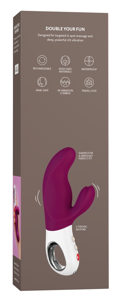 This wonderful anatomically designed vibrator combines G-spot simulation with intense clitoris stimulation. Two quiet, separately adjustable motors (one in the shaft, one in the clit tickler) pleasure the user with six vibration intensities and six vibration rhythms. Approx.17.5 cm long, Ø 3 to 4.2 cm. 100% waterproof. With a keypad lock for secure transport. Rechargeable vibrator - original USB magnetic cable is included. Material: silicone.