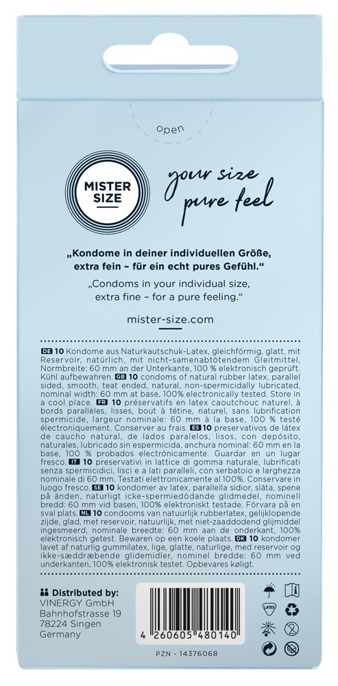 Transparent, extremely thin Mister Size condoms (60 mm) made out of natural rubber latex. The condoms are covered in lubricant and are teat-ended. Vegan.