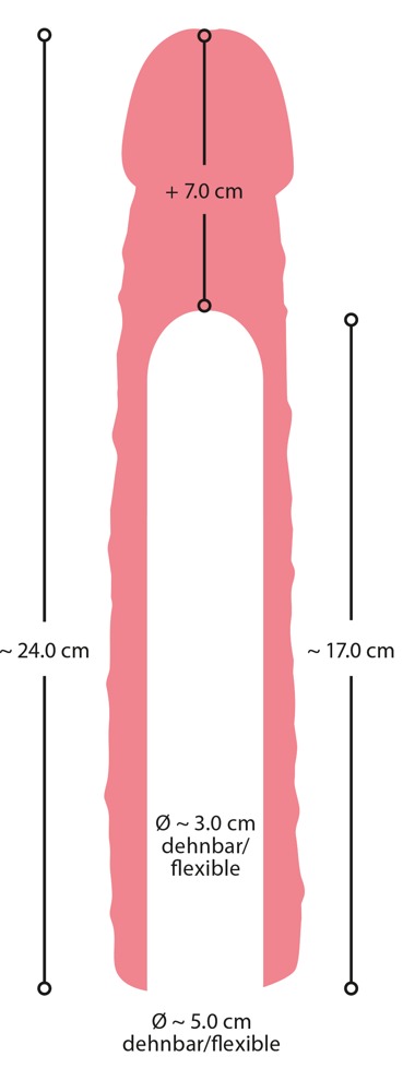 Complete length 24 cm, insertion depth 17 cm, inner Ø 3 cm (very flexible), outer Ø max. 5 cm. Weight 254 g. TPE.