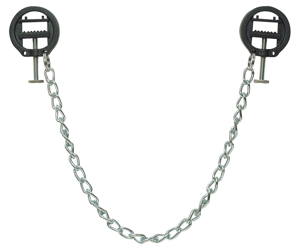 2 round nipple screw clamps that are joined together by an extremely light metal chain. The pressure strength can be adjusted.