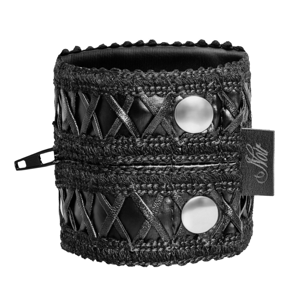 High-quality wristlet wallet from Noir in a sophisticated black powerwetlook with elaborate embellishments. With discreet secret compartment and almost invisible zip. Not just a fashionable accessory, but also a safe place to keep money and keys. Soft and comfy, adjustable to 2 sizes with press studs.