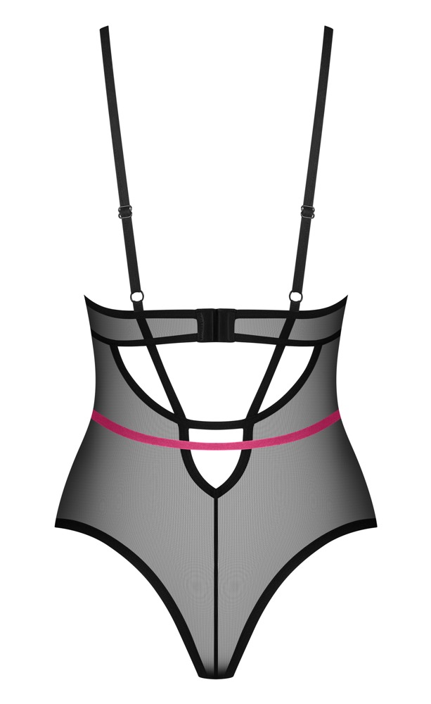 The thong body, Novenes from Obsessive, is made out of delicate black powernet with pink strap accentuation at the front and the back. It is soft and stretchy for an extremely comfortable fit. There are straps over the cleavage area and a beautiful rhinestone element between the soft cups. The straps and the hook fastener at back can be adjusted.