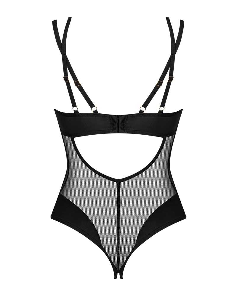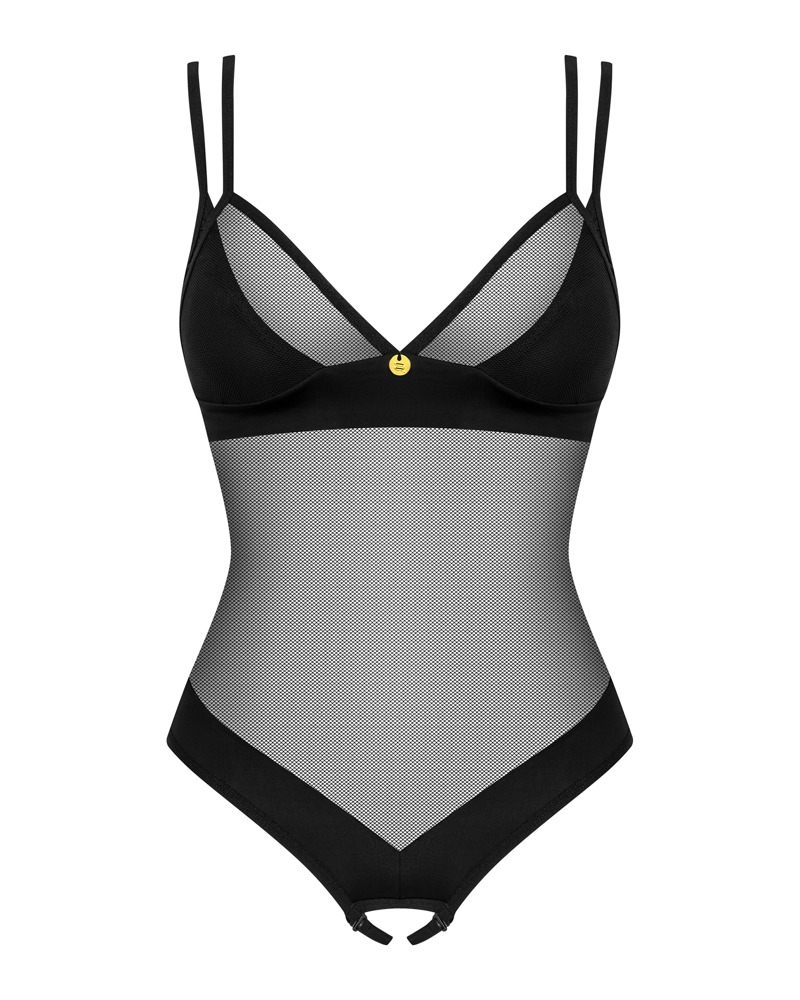 Black crotchless body Nesari by Obsessive. Fine elasticated mesh with opaque details. Soft and stretchy all around for a high level of comfort. Bra with a decorative element between the cups and adjustable hook fastener in the low back cut-out. The cleverly crossed double straps can also be adjusted to fit. The crotch with two string straps is seductively exposed.