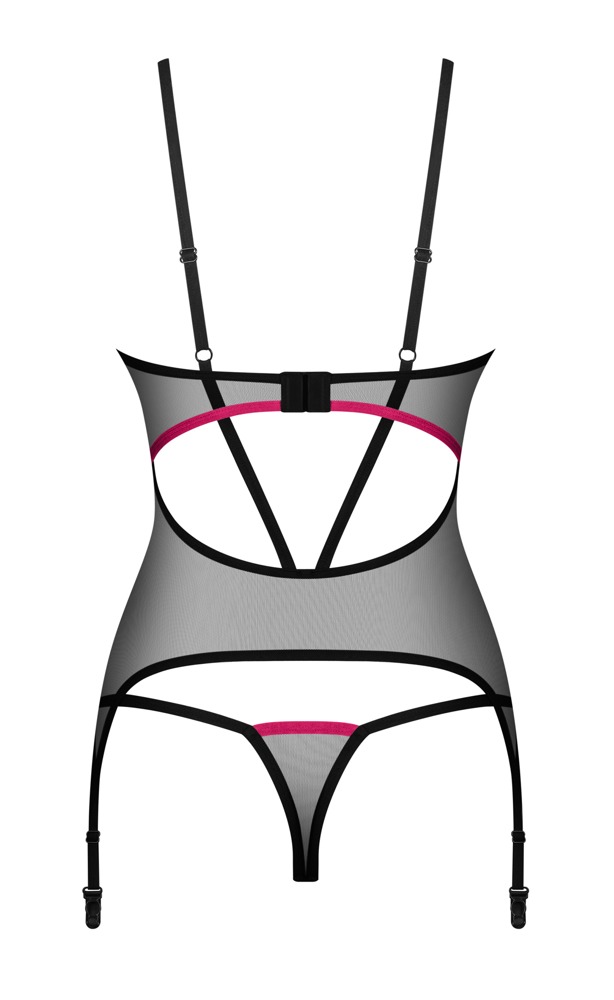 The 2-piece suspender set, Novenes from Obsessive, has a basque and thong. Everything is made out of delicate black powernet with pink strap accentuation. There are straps over the cleavage area and a beautiful rhinestone element between the wireless cups. The bra and suspender straps can be adjusted to fit. The basque also has a hook fastener at the back as well. The small thong adds the finishing touch to this elegant, transparent set.